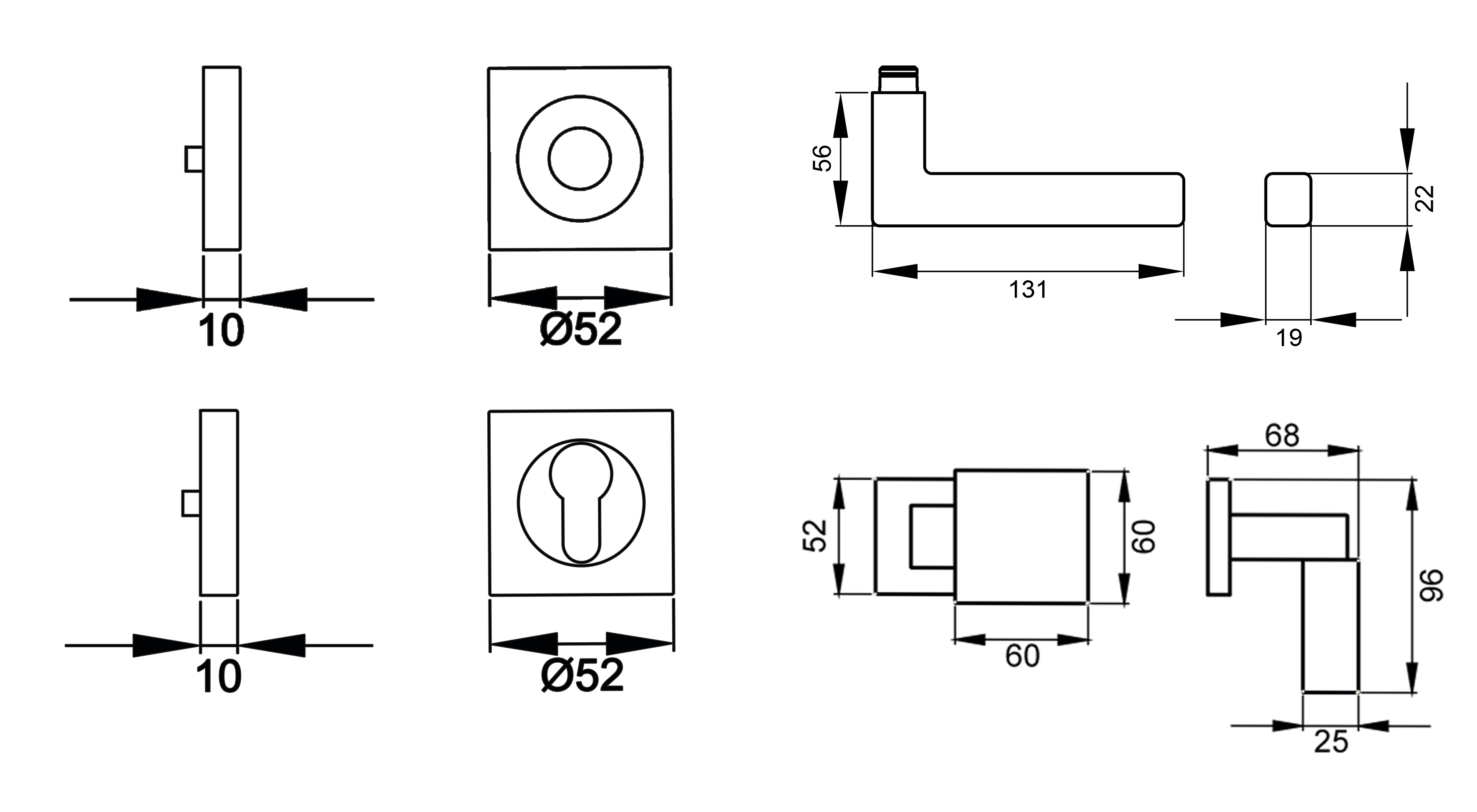 ER46Q - Seattle auf dreiteiliger, quadratischer Rosette in Edelstahl matt, Wechselgarnitur mit Knopf EK550 links, Gebrauchskategorie 3 nach DIN/EN1906 für Türstärke 38mm - 48mm