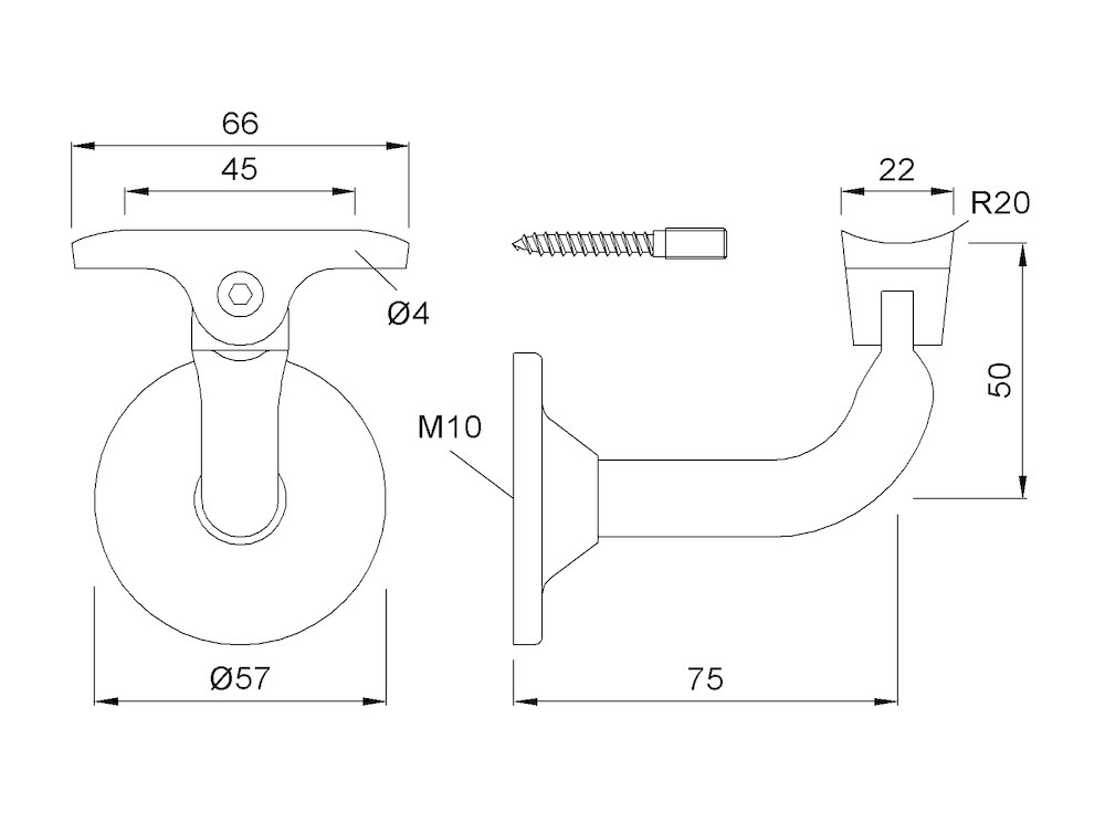 KWS Handlaufstütze 4511; Ausführung: mit gewölbter Auflage; Material: Stahl; Befestigungsart: verdeckt verschraubt; Breite Auflage: 22 mm; Radius Auflage: 20 °; Länge Auflage: 66 mm; Einsatzbereich: Gebäudeausstattung; Basis: Handlaufstütze; Oberfläche: einbrennlackiert; Lieferung: mit Stockschraube M10x80; Wandabstand: 75 mm; Gewindedurchmesser: M10; Farbton: silberfarbig; Außendurchmesser Abdeckkappe: 57 mm; Material Auflage: Aluminium