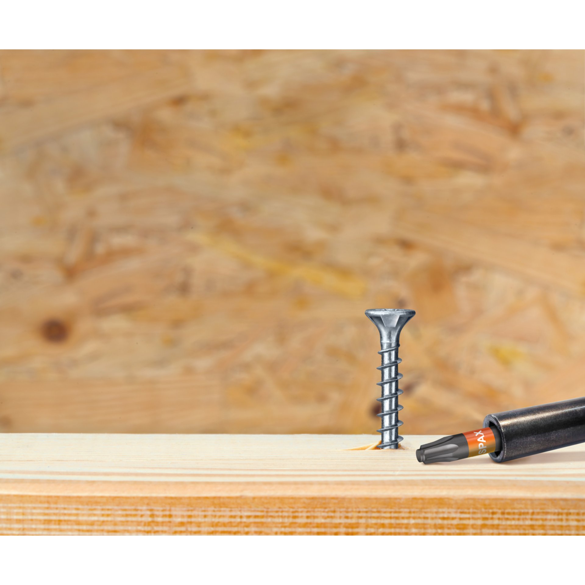 Die Universalschraube ist der absolute Allrounder im Sortiment von SPAX. Sie kann fast alles – zum Beispiel ganz ohne das nervige Vorbohren in Nadelhölzer wie Fichten- und Kiefernholz sowie in die gängigen Holzwerkstoffplatten (MDF, Span- und OSB-Platten) eingedreht werden. Dabei spielt unsere Universalschraube ihre Überlegenheit vor allem im Innenausbau- und Möbelbaubereich aus, aber auch außen ist sie mit dem passenden Korrosionsschutz gut verwendbar. Durch ihre besondere Gewindegeometrie ist der Eindrehwiderstand beim Schrauben wesentlich geringer als bei herkömmlichen Schrauben, was nicht nur Ihre Kräfte und Nerven, sondern natürlich auch den Akku des eingesetzten Schraubers schont. Ein Aufspleißen des Holzes in Randnähe wird nahezu vollständig unterbunden. Das bedeutet für Sie: Sie drehen mehr Schrauben pro Akkuladung ein, und Sie müssen sich keine Sorgen um aufgerissene Holzenden mehr machen!